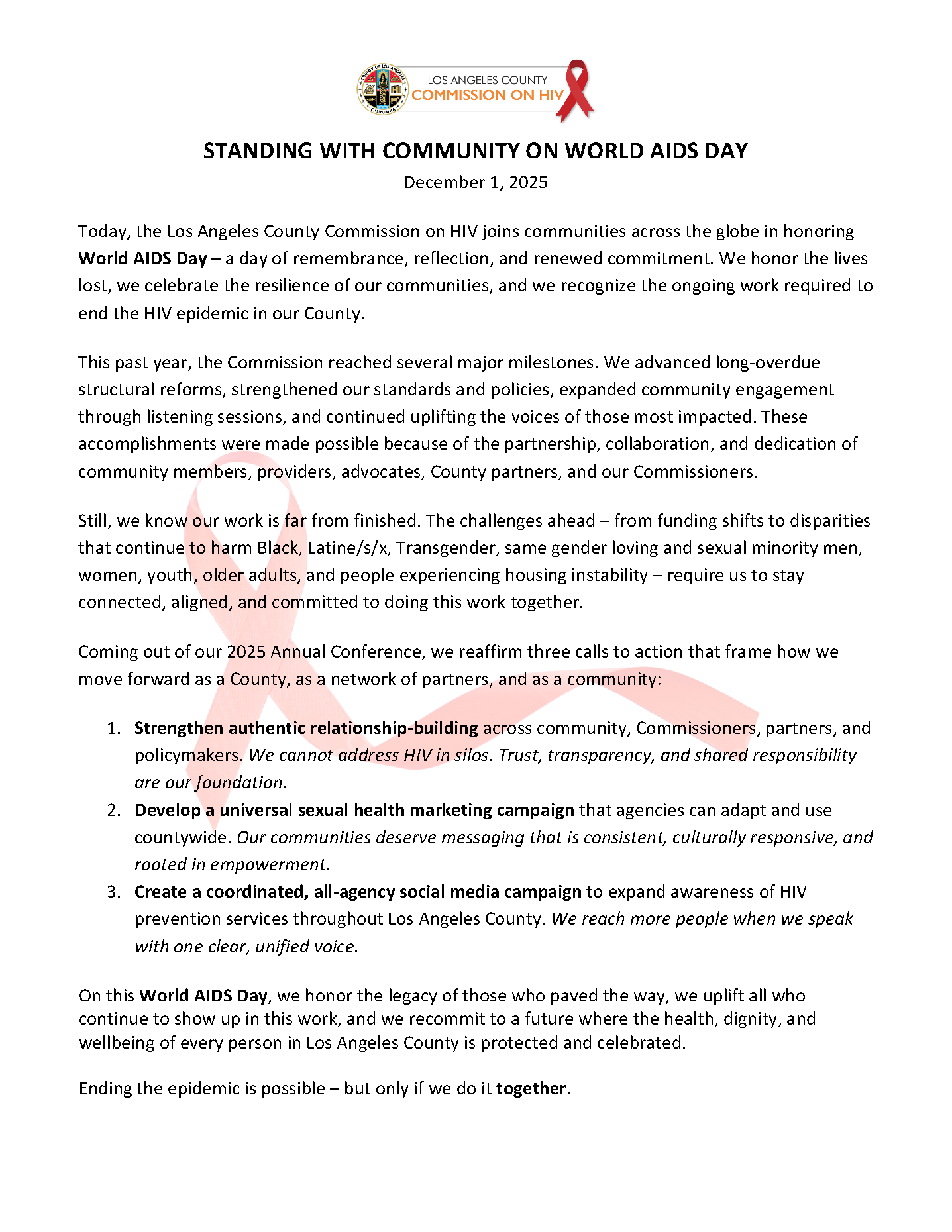 The Los Angeles County Commission on HIV focuses on the local HIV/AIDS epidemic and responds to the changing needs of People Living With HIV/AIDS within the communities of Los Angeles County.